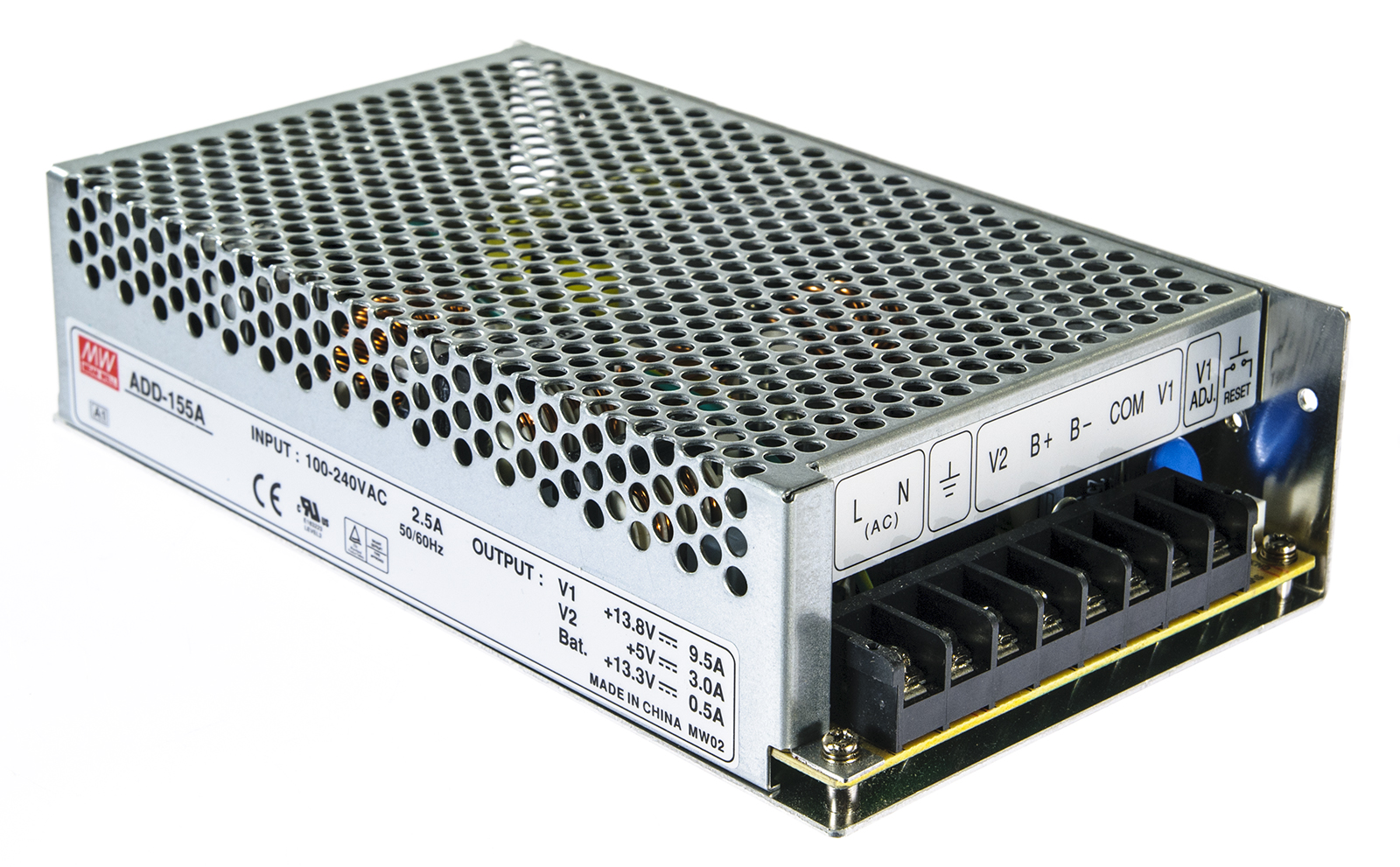 ADD-155A to dwuwyjściowy impulsowy zasilacz buforowy, posiadający wbudowaną przetwornicę zapewniającą stałe napięcie 5 V. Charakteryzuje się napięciem wyjściowym 12 - 14,5 V oraz uniwersalnym napięciem zasilania AC. Urządzenie posiada zabezpieczenie chroniące przed zbytnim rozładowaniem baterii.