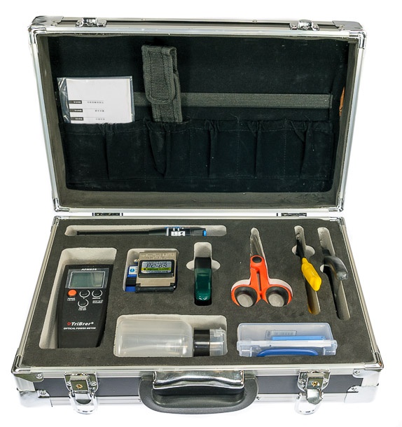 Nóż do obcinania włókien z zestawem narzędzi do zakańczania kabli swiatłowodowych.