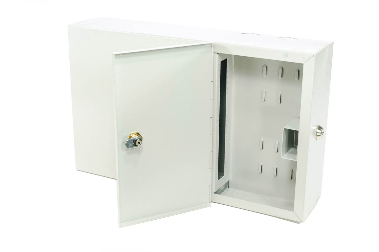 Dzielona rozdzielnica naścienna. Dzięki dzielonej konstrukcji w skrzynce tej mamy wygodny dostęp do miejsca spawania i zapasu kabla. Na tylnej ściance znajdują się liczne przetłoczenia umożliwiające montaż opasek zaciskowych w celu uporządkowania i organizacji układanych przewodów. Na górnej i dolnej ściance części stałej znajdują się otwory (do wybicia) na wprowadzenie rur instalacyjnych z kablem.