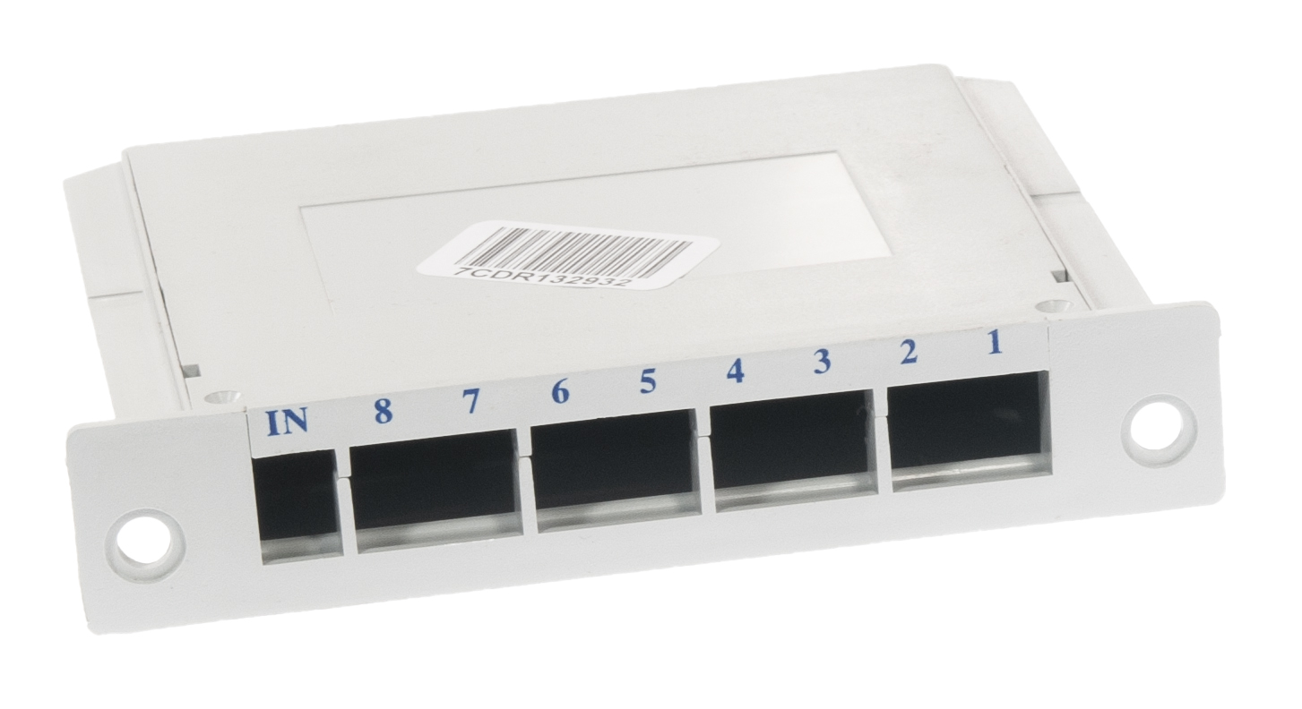 Oferowany produkt to kasetka PLC 1x8, w której możemy zamontować splitter PLC. Montaż jest bardzo prosty - splitter umieszczamy wewnątrz kasetki, końcówki z adapterami wkładamy w odpowiednie miejsca z przodu. Poniższe zdjęcie przedstawia widok już po instalacji:
