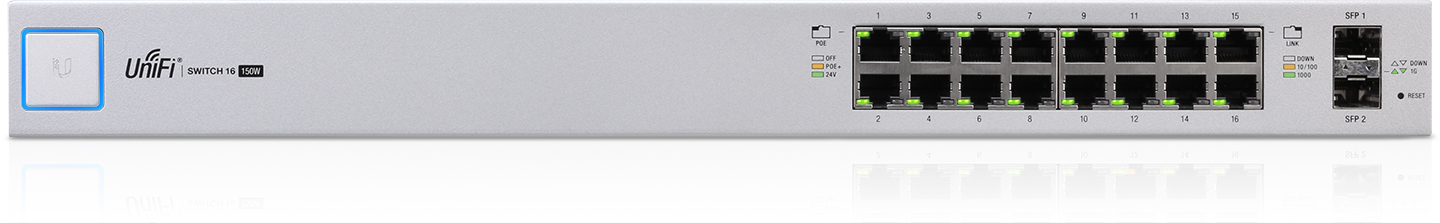 Ubiquiti US-16-150W to zarządzalny przełącznik (switch) pracujący w oparciu o oprogramowanie UniFi. Posiada 16 gigabitowych portów Ethernet oraz 2 sloty SFP. Oferuje zasilanie PoE na każdym porcie Ethernet, jest kompatybilny z pasywnym PoE 20 - 27 V oraz standardem PoE+ IEEE 802.3af/at (48 V). Maksymalna moc na port wynosi 34,2 W dla PoE+ i 17 W dla pasywnego PoE, a maksymalna moc na całe urządzenie - 150 W. Switch posiada wbudowany zasilacz AC/DC.