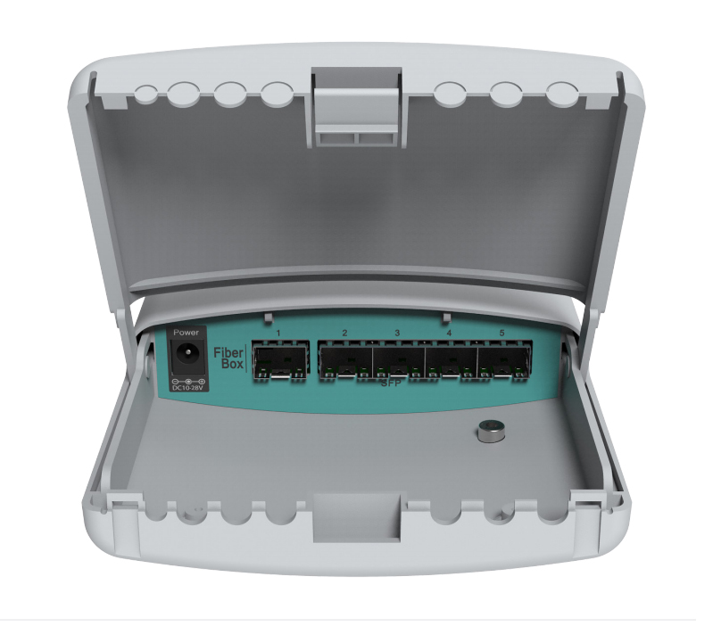CRS105-5S-FB to switch MikroTika wyposażony w 5 slotów SFP. Urządzenie wyposażone jest w obudowę przystosowaną do wykorzystania na zewnątrz budynków. Przełącznik posiada procesor QCA8511 o taktowaniu 400 MHz i 128 MB pamięci RAM. W zestawie znajdują się akcesoria umożliwiające montaż na słupie. FiberBox doskonale nadaje się do zastosowania przy bazach, do których trzeba doprowadzić kabel o długości przekraczającej możliwości zwykłej skrętki.