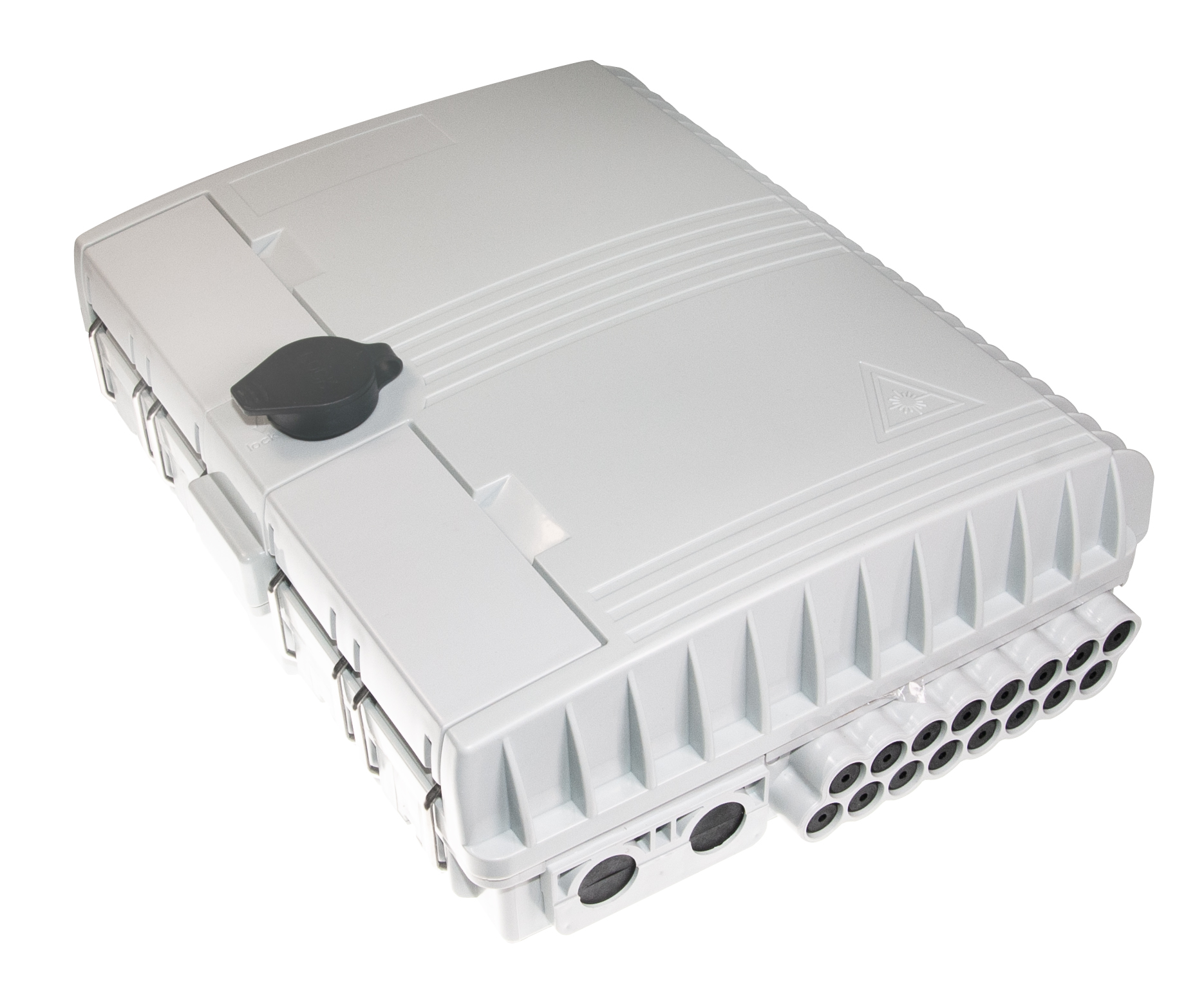 Mufa światłowodowa FDB-0216G-C-CAS wyposażona w 2 wejścia na kable magistralne i 16 otworów wyjściowych. Wejście na kable magistralne mają przepust typu dyby umożliwiający przeprowadzenie kabli bez rozcinania. Otwory wyjściowe zabezpieczone są gumowymi zatyczkami. Mufa ma solidną konstrukcję, dwie zewnętrzne klamry dociskają pokrywę i zapobiegają rozszczelnieniu.