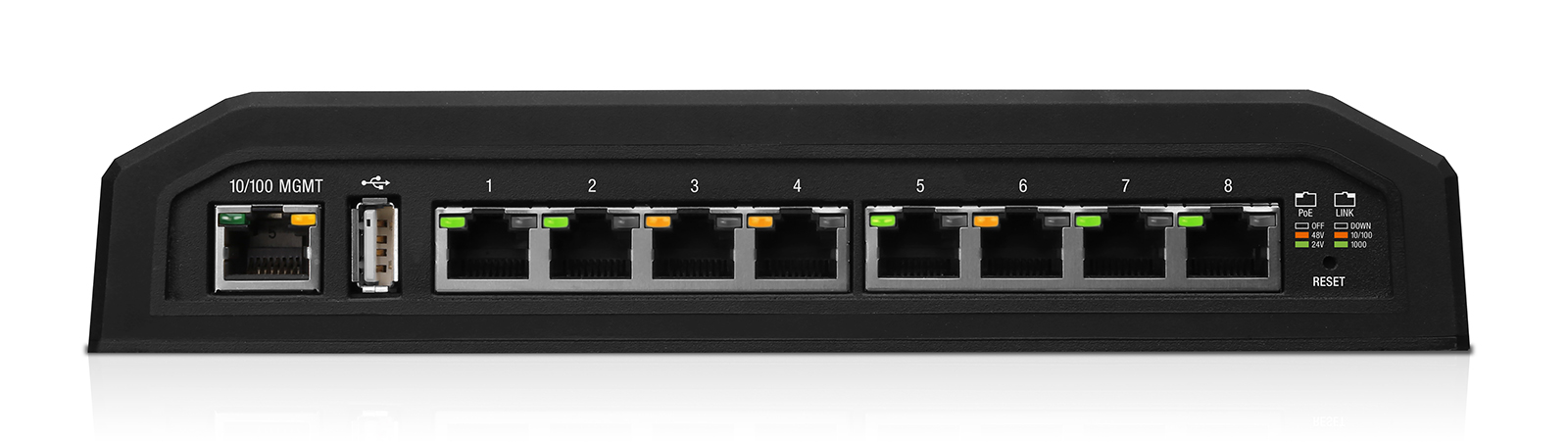 Ubiquiti EdgeSwitch 8XP to zarządzalny switch (przełącznik) wyposażony w 8 gigabitowych portów Ethernet. Na wszystkich portach posiada wyjście PoE 24 lub 48 V (do wyboru w oprogramowaniu), dzięki czemu może zasilać inne urządzenia. Napięcie podawane jest na parach 4, 5+ / 7, 8-, czyli tak jak w standardowych zasilaczach z pasywnym PoE. Produkt oferuje zarządzanie Layer2, wspiera takie funkcje jak port monitoring, konfigurację VLAN czy STP i RSTP. Na danym porcie, w razie potrzeby, można wyłączyć PoE. Maksymalna moc wyjściowa wynosi 11,5 W na port przy zasilaniu 24 V i 23 W na port przy zasilaniu 48 V. Zarządzanie odbywa się poprzez intuicyjny interfejs Web.