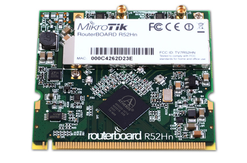 R52Hn to karta Wi-Fi wyprodukowana przez łotewską firmę MikroTik SIAo wysokiej mocy ~320mW. Karta pracuje w pasmach 2,4GHz oraz 5GHz iobsługuje wszystkie standardowe tryby pracy IEEE 802.11 a/b/g/n . R52Hn umożliwia uzyskanie fizycznej prędkości do 300Mbps, co daje do 200Mbps rzeczywistej przepustowości. Karta RouterBOARD R52Hn miniPCIposiada dużą moc nadawania i wysoką czułość co w rezultacie zapewniawysoką wydajność i stabilność. Do dodatkowych zalet karty możnazaliczyć niski pobór mocy oraz zabezpieczenie przeciwprzepięciowe do10kV na porcie RF.
