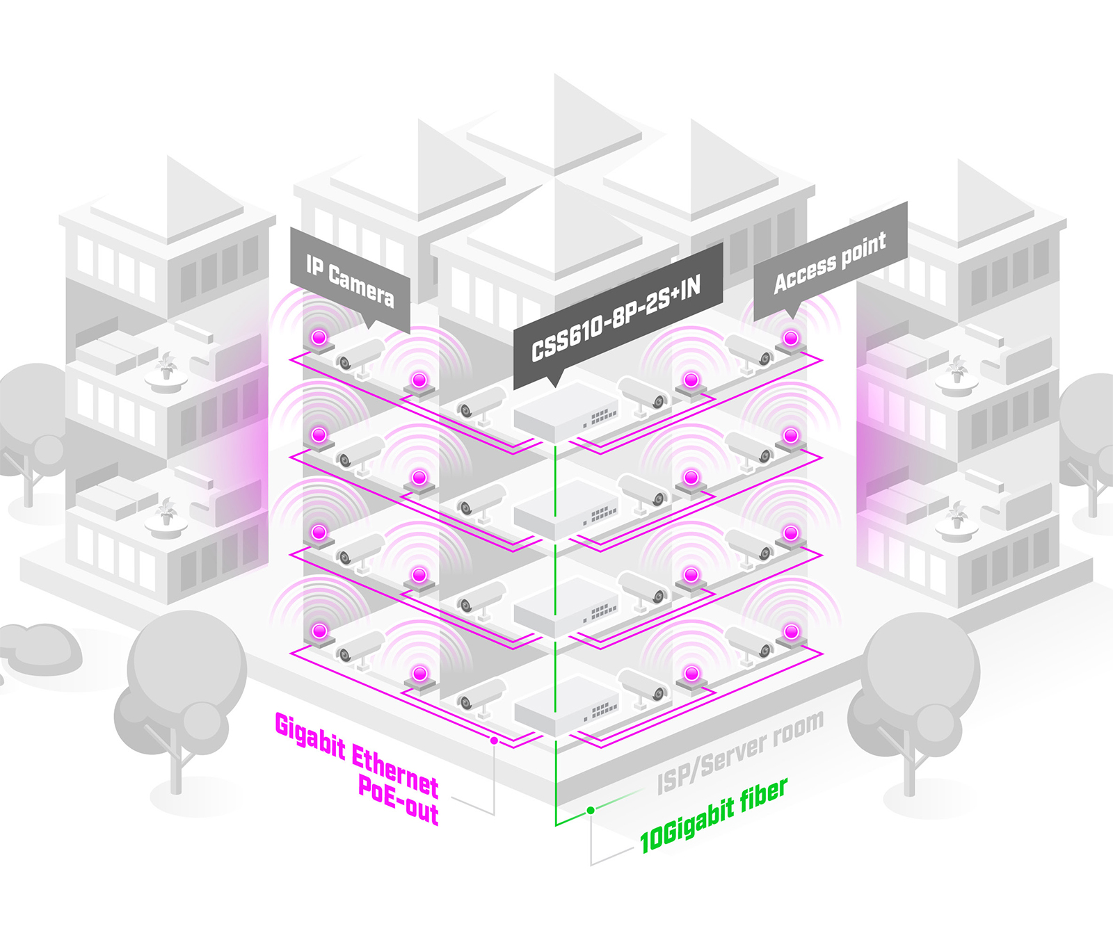 Switch dzięki atrakcyjnej cenie i swoim możliwościom ma bardzo wiele zastosowań. Standard PoE 802.3af/at jest szeroko stosowany przez wielu producentów, nie tylko MikroTika. Najpopularniejszym zastosowaniem będą sieci złożone z kamer IP lub punktów dostępowych. Zwłaszcza w drugim scenariuszu CSS610-8P-2S+IN pokaże swoje zalety, ponieważ posiada gigabitowe porty Ethernet, a tym samym nie ograniczy przepustowości podłączonych AP. Switch sprawdzi się w małej sieci, nawet domowej, jak również w większych firmach. Dzięki atrakcyjnej cenie możesz zastosować jedno urządzenie na każdym piętrze lub wydzielić sieć na osobne segmenty. W takim zastosowaniu kilka switchy 8-portowych sprawdzi się lepiej niż jeden, duży, np. 24-portowy. Ważną zaletą są porty SFP+ - jednym portem możesz dostarczyć transmisję o dużej przepustowości (do 10 Gb/s), a drugim portem przekazać ją dalej, do kolejnego urządzenia. To ułatwia stworzenie szkieletu sieci o wysokiej prędkości, zachęca również do podziału sieci na różne segmenty.