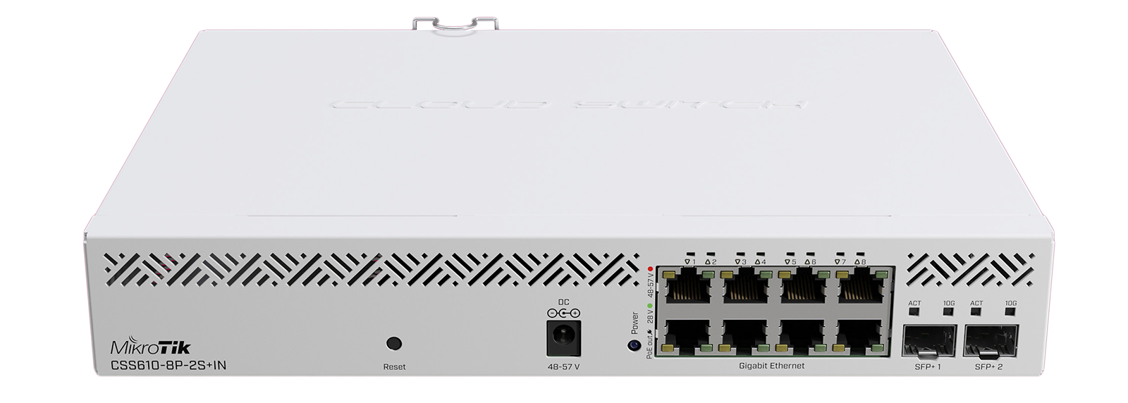 MikroTik CSS610-8P-2S+IN to zarządzalny switch wyposażony w 8 gigabitowych portów Ethernet (10/100/1000 Mb/s) oraz 2 sloty SFP+ (10 Gb/s). Na każdym z portów Ethernet znajduje się wyjście zasilania PoE w standardach IEEE 802.3af/at. Łączny budżet mocy zasilania wynosi 140 W, w zupełności więc wystarczy do kamer IP lub punktów dostępowych. Zarządzanie obejmuje funkcje Layer 2, takie jak port-to-port forwarding, broadcast storm control, filtrowanie adresów MAC czy konfiguracja VLANów. Switch posiada niewielką obudowę typu desktop, ale w zestawie znajdują się długie uszy umożliwiające montaż w szafie rack 19". Urządzenie jest wyposażone we wbudowany zasilacz typu AC.