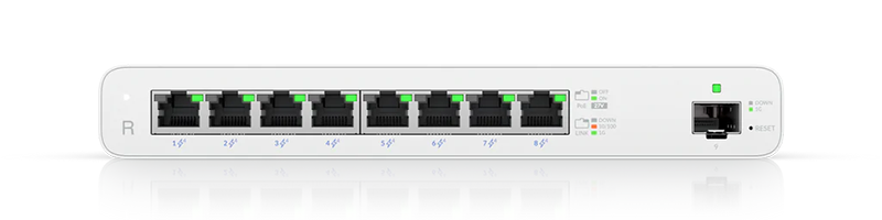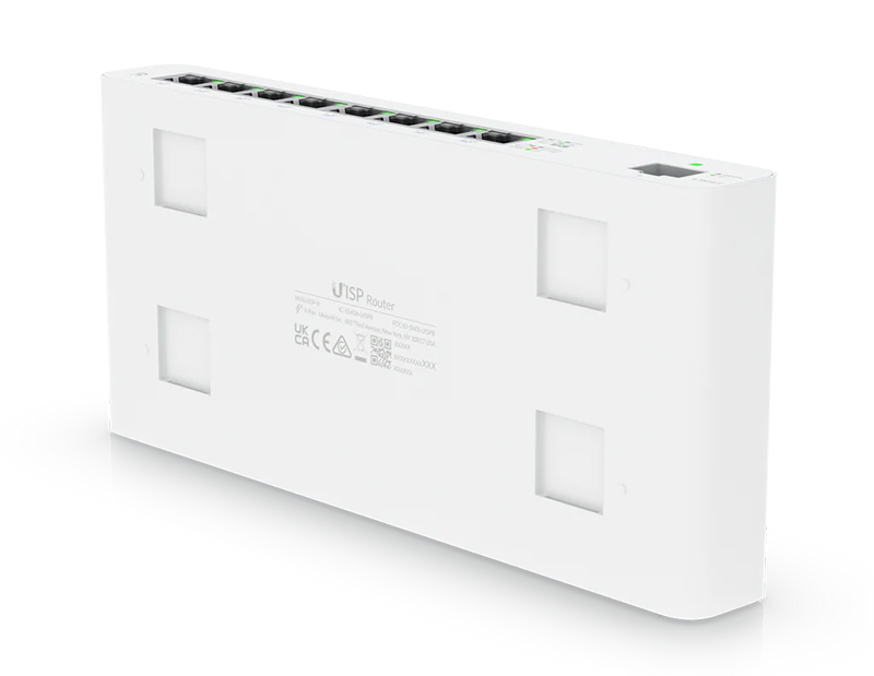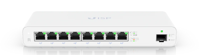 Ubiquiti UISP-R to router wyposażony w 8 gigabitowych portów Ethernet (10/100/1000 Mb/s) oraz 1 slot SFP. Na każdym z portów Ethernet znajduje się wyjście zasilania PoE, urządzenie obsługuje pasywne PoE o napięciu 27 V DC. Maksymalna moc wyjściowa na port wynosi 30 W, na całe urządzenie 110 W. Router wspiera podstawowe funkcje zarządzania, konfiguracja odbywa się tylko i wyłącznie poprzez scentralizowaną platformę UISP. Maksymalny pobór mocy samego UISP-R wynosi zaledwie 10 W, w zestawie znajdziesz zasilacz 27 V DC, 4,4 A.