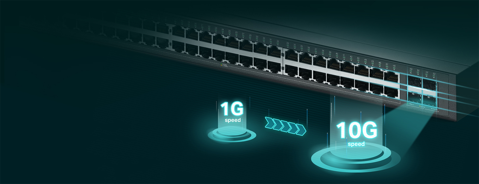 Oferowany produkt jest wyposażony w 48 gigabitowych portów Ethernet (10/100/1000 Mb/s) oraz 4 sloty SFP+. Dzięki slotom SFP+ możesz stworzyć połączenia o przepustowości 10 Gb/s, które wykorzystać do łączenia poszczególnych elementów szkieletu sieci lub wymagających urządzeń (np. serwera).