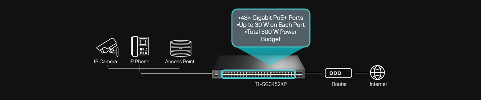 Switch jest kompatybilny ze scentralizowaną platformą Omada, która umożliwia zdalne zarządzanie i monitorowanie całej sieci. Platforma jest dostępna również w chmurze, możesz się z nią połączyć w dowolnym miejscu z dostępem do internetu. Kompatybilność z Omadą sprawia, że SG3452XP jest doskonałym wyborem do sieci typu hotspot złożonej z wielu punktów dostępowych pracujących pod kontrolą systemu Omada. W takim przypadku wszystkimi urządzeniami możesz zarządzać w jednym miejscu, w szybki i wygodny sposób.