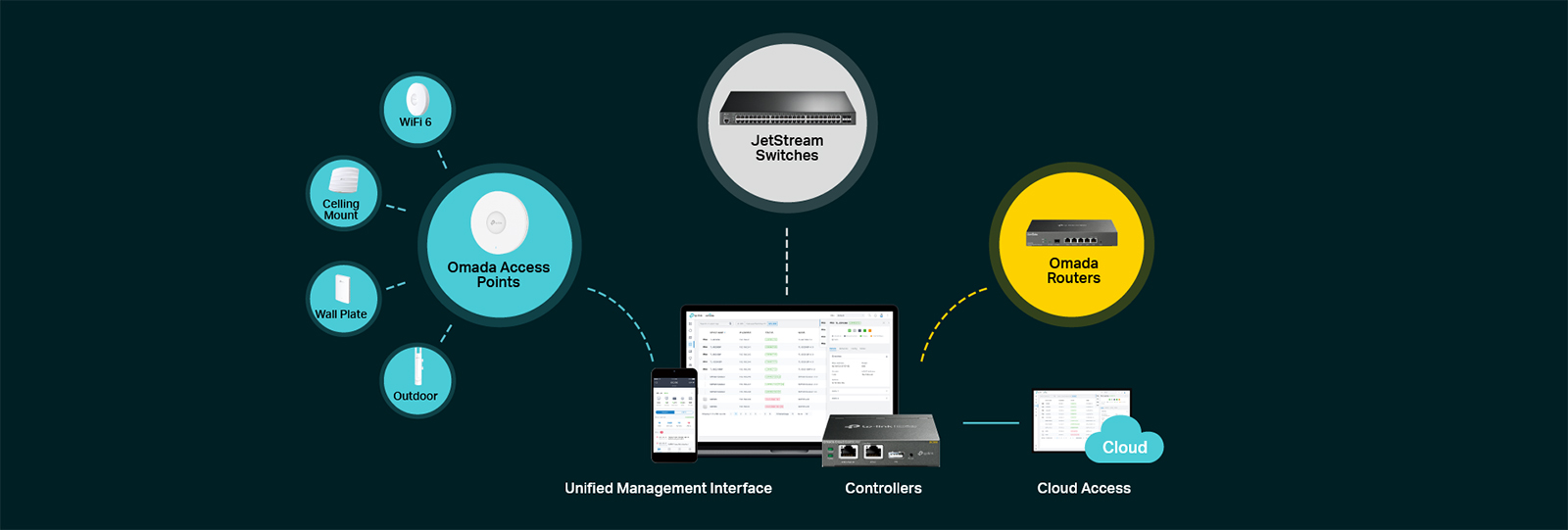 | Zarządzanie centralne | Kontroler sprzętowy Omada (OC300) Kontroler sprzętowy Omada (OC200) Kontroler programowy Omada Kontroler Omada oparty na Chmurze |