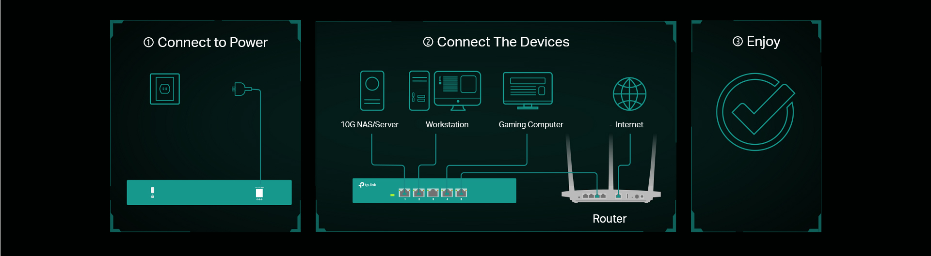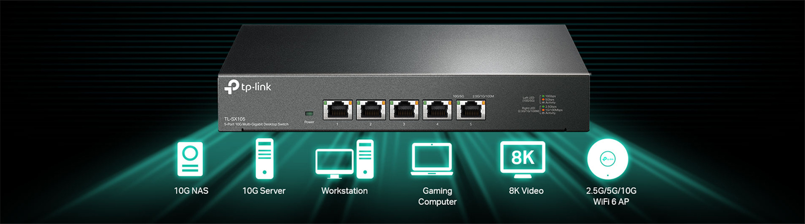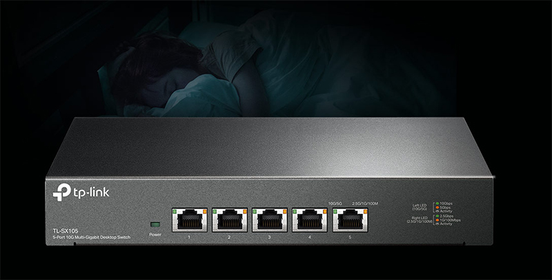 Switch SX105 został wyposażony w 5 portów Ethernet o przepustowości do 10 Gb/s każdy. Zapewnia dużą przepustowość przełączania - do 100 Gb/s, doskonale sprawdzi się w wymagających sytuacjach. Każdy z portów obsługuje automatyczną negocjację prędkości połączeń, mogą działać w trybie 100 / 1000 / 2500 / 5000 / 10000 Mb/s. SX105 to bardzo dobre rozwiązanie do podłączenia serwera, NASa, punktu dostępowego z portem 2.5/10G czy nawet komputera wyposażonego w odpowiednią kartę sieciową.