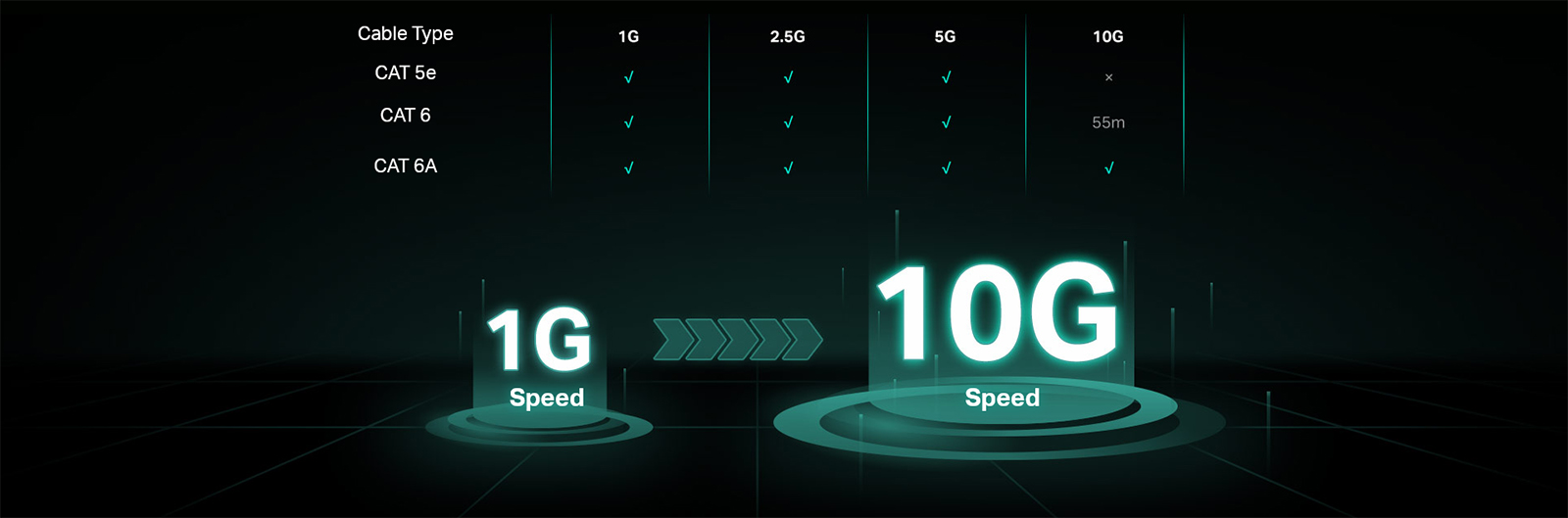 Korzystając z portów Ethernet podczas zmiany sieci na standard 10 Gb/s nie musisz wymieniać od razu całego okablowania! Na krótszych odcinkach wystarczy ci nawet kabel w standardzie 5e, na dłuższe dystanse sprawdzi się kat. 6 lub wyższa.