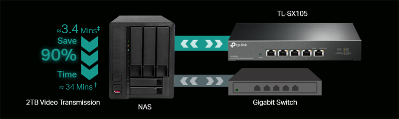 Dzięki przepustowości 10 Gb/s możesz bardzo szybko transferować pliki z serwera wykorzystując sieć lokalną. Nie musisz już długo czekać aż zostanie wykonana kopia zapasowa konfiguracji, z SX105 cała procedura skończy się w mgnieniu oka.
