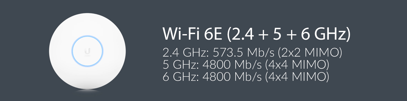 U6-Enteprise wspiera nowoczesną sieć Wi-Fi 6E, może pracować w trzech pasmach jednocześnie: 2,4, 5 i 6 GHz. Obsługuje protokoły IEEE 802.11 b/g/n/ax w 2,4 GHz oraz IEEE 802.11 a/n/ac/ax w 5 i 6 GHz, wykorzystuje 2x2 MIMO w 2,4 GHz i 4x4 MIMO w 5 / 6 GHz. Wi-Fi 6E korzysta z tych samych protokołów i technologii co Wi-Fi 6, ale zapewnia dodatkową transmisję w paśmie 6 GHz. Dzięki temu znacznie zwiększona jest prędkość transmisji, w tym urządzeniu maksymalna teoretyczna przepustowość wynosi 573,5 Mb/s w 2,4 GHz, 4800 Mb/s w 5 GHz oraz 4800 Mb/s w 6 GHz. Zastosowanie nowej częstotliwości oznacza również odcięcie transmisji od wielu zakłóceń, które znajdują się w zatłoczonych pasmach 2,4 i 5 GHz.